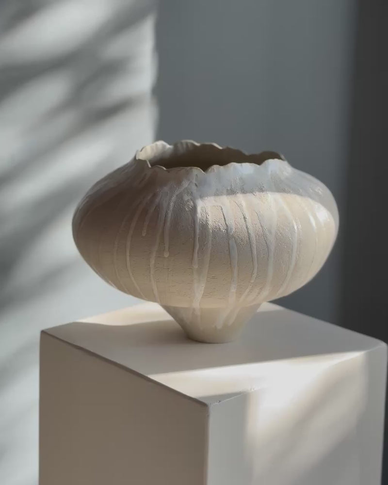Váza slovenské keramičky Lucie Okánikové ztělesňuje dialog mezi syrovou hlínou a živou energií glazury. Ručně točené tělo s měkce oblou siluetou a úzkou základnou je zvýrazněno bílou glazurou stékající po povrchu, která na objektu vytváří dojem pohybu a spontánnosti.