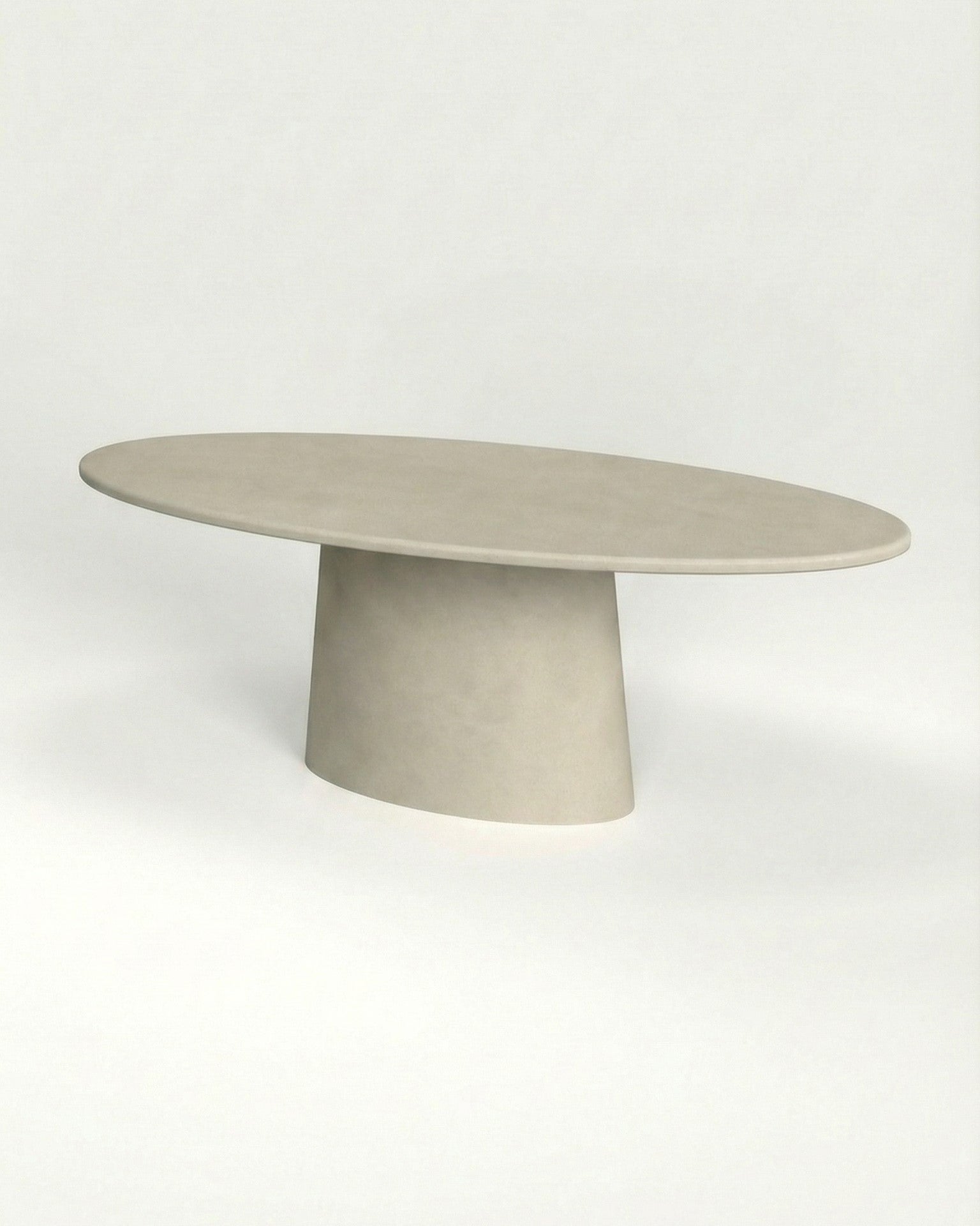 The rounded tabletop offers comfortable seating from all sides, while the central base provides solid support and keeps the overall form visually light. Each table is hand-finished in microcement, resulting in a natural matte surface that is smooth and durable.
